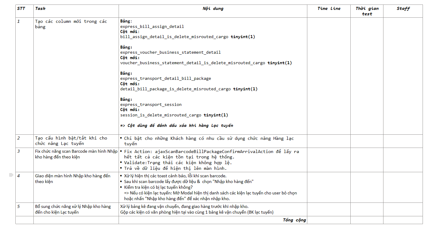- Bổ sung tính năng cho phép Tài xế/User tại Bưu cục/điểm đích được phép scan và nhập kho các kiện hàng lạc tuyến để tiếp tục quy trình xử lý (trả về hoặc chuyển tiếp).